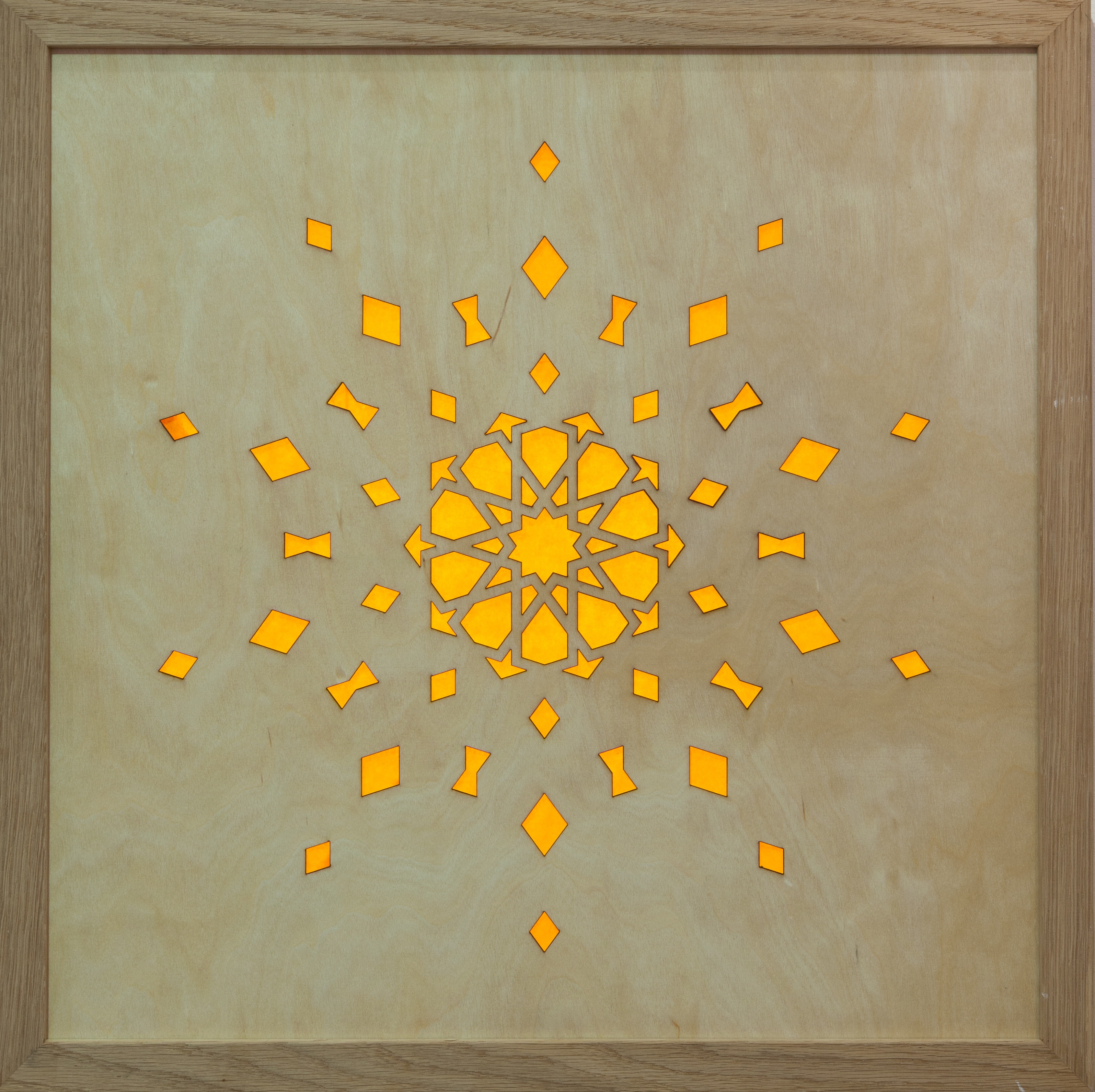 Posted on 24/01/201616/02/2016 by Andrew Mark Franks 10-fold star. ‘The Mother’ Laser-cut wood veneer, coloured perspex and tissue paper. 45.5cm x 45.5cm. Sold