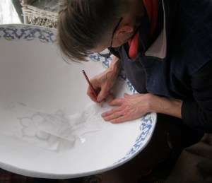 Inscribing the design onto a large bowl.